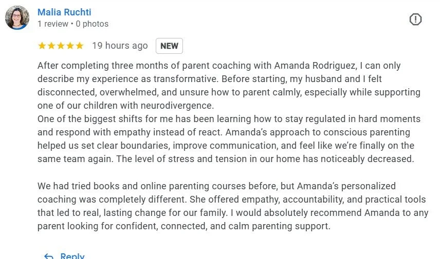 We had tried books and online parenting courses before, but Amanda’s personalized coaching was completely different. She offered empathy, accountability, and practical tools that led to real, lasting change for our family. I would absolutely recommend Amanda to any parent looking for confident, connected, and calm parenting support.”